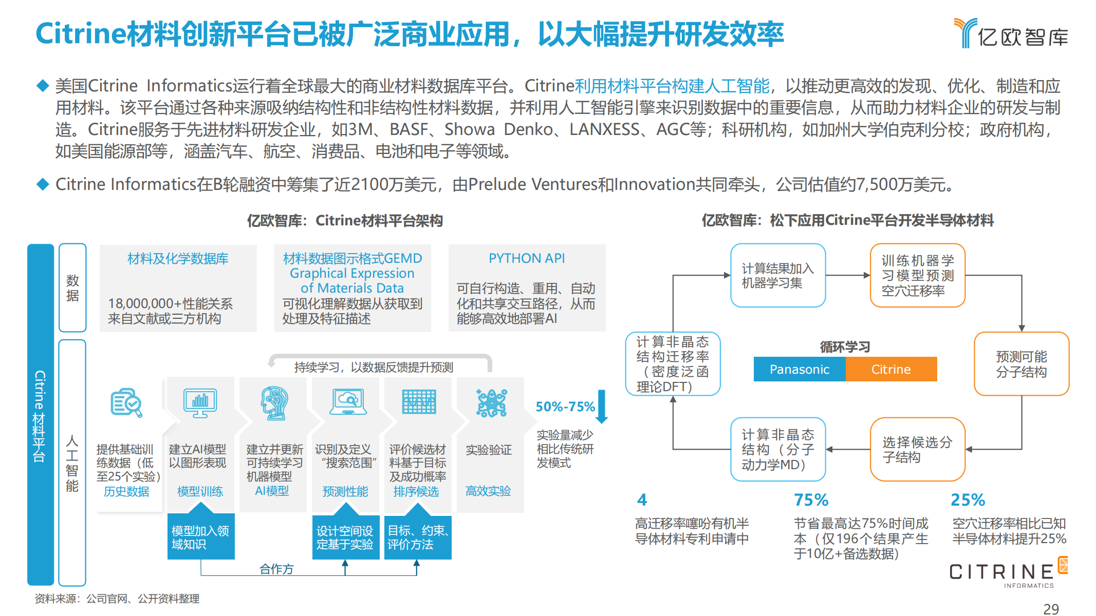 使用人工智能技术的材料研发,能够在物性预测和新材料研发过程中,基于更强的数据分析能力,同时利用机器学习算法,自动优先选择最能提供实验合成和测试所需信息的化合物,简化材料科学家耗费在数据分析、大规模文献查阅和实验等工作上的时间。机器学习已被证明可以有效加速材料的研发进程,通过机器学习获得的材料模型及机理,进而用于材料发现和设计。